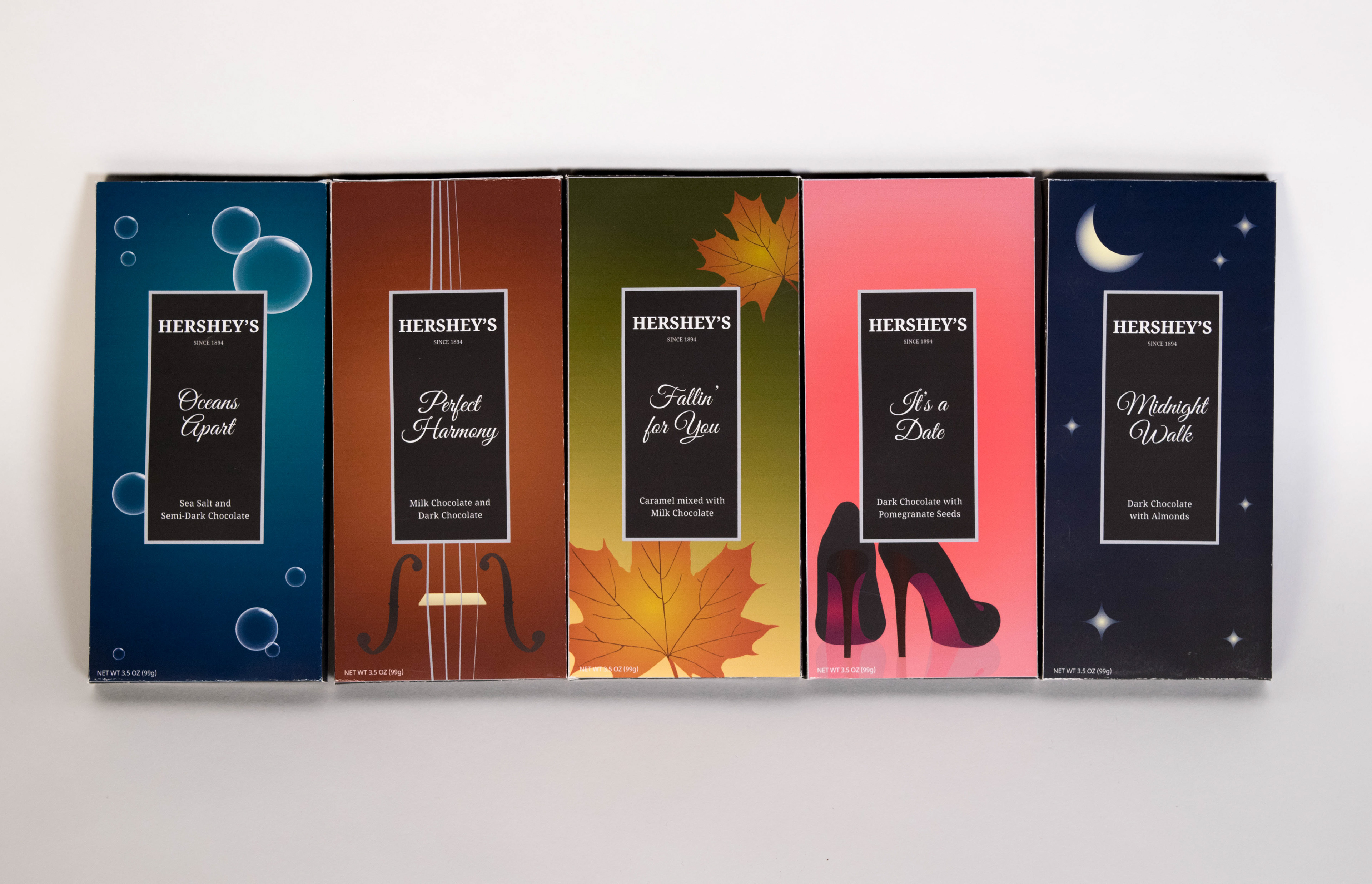 I wanted the package design to stand out rather than the brand name. Even though every bar has its own unique design and color palette, they're unified with the typographic treatment of the Hershey brand name and their cursive title. I created five new flavor types with a brief description on the back explaining why this chocolate is right for you.