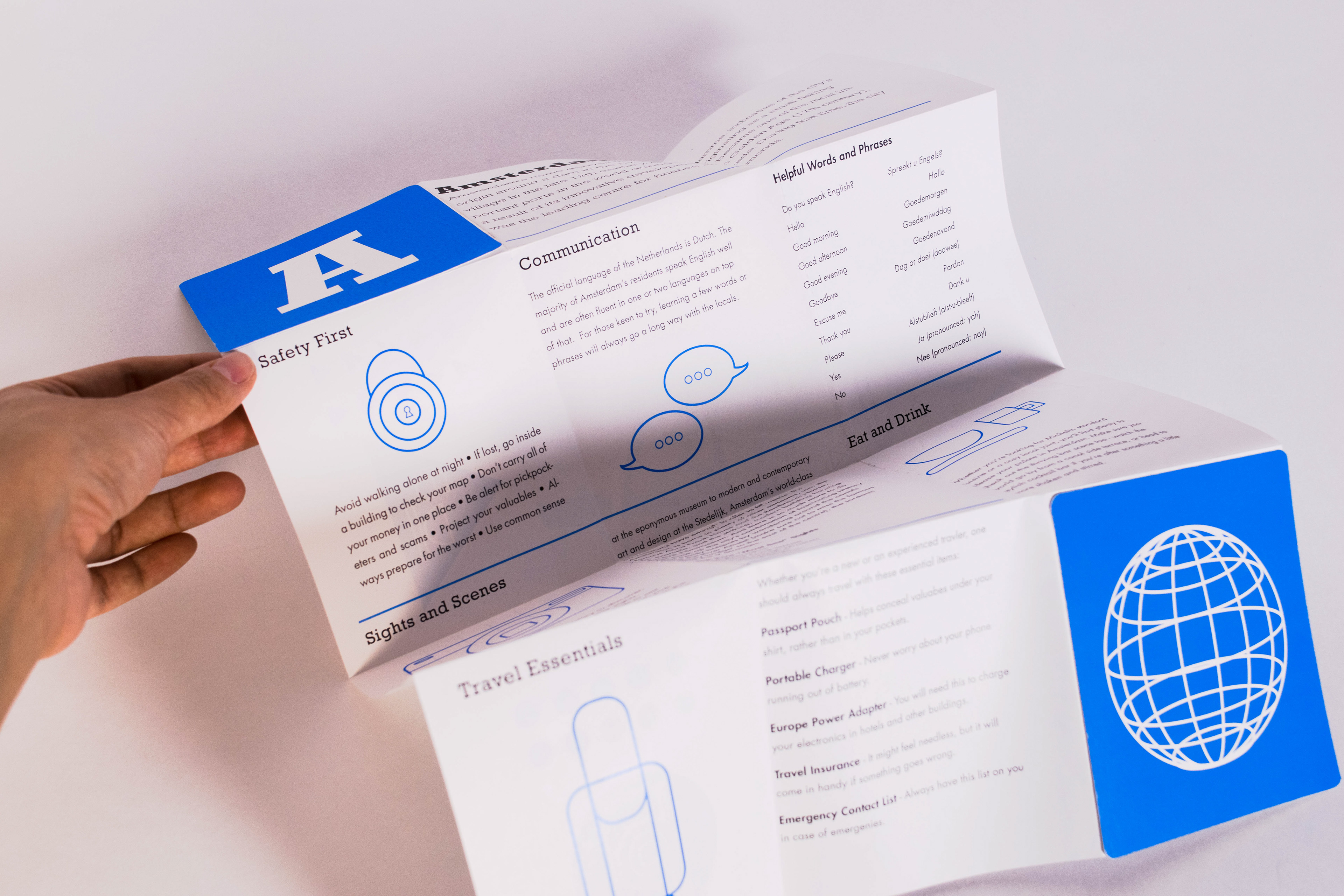 Like many people my age, I'm interested in traveling the world, but I don't want to appear like an obvious tourist. To combat the tourist stigma, I created a compact travel guide allowing the user to remain discreet yet informed. I highlighted the city of Amsterdam because it's been on my destination list for a while now, and I wanted to use this project as an opportunity to do research. I began by sketching out various icons that I associate with traveling, and eventually narrowed them down to five: a padlock, speech bubbles, a camera, a dining set up, and a luggage.
